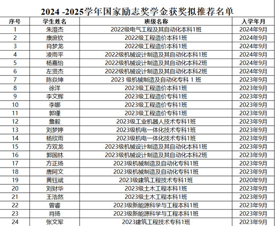 智能制造与建造学院2024—2025学年国家励志奖学金拟推荐结果公示