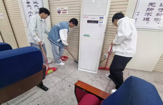 活动伊始,志愿者和毕业生党员们明确了校园清扫的核心目标、具体分工与安全注意事项,随后迅速响应、各司其职,按既定分组有序投入工作。有人手持扫帚清扫会议室地面,麻利归拢散落杂物;有人持抹布擦拭桌面、座椅扶手,细致拂去各处尘埃。现场分工明确、配合默契,大家用双手攻克卫生盲区,以实际行动诠释“奉献、友爱、互助、进步”的志愿精神,让青春暖流在劳动中传递。