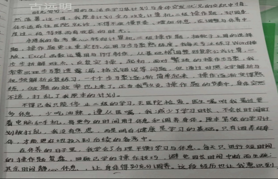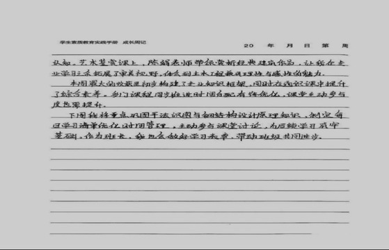 同学们围绕课堂学习的所思所悟、校园生活的温暖瞬间、个人成长的困惑等主题,用简单的文字记录下自己的青春足迹。有同学在周记中细致剖析了专业课程中的难点问题,分享了通过查阅资料、与同学探讨最终攻克难题的喜悦;有同学以细腻的情感记录了与室友的相处日常、参与社团活动的难忘经历,字里行间充满了对大学生活的热爱与对未来的憧憬。这些周记不仅展现了同学们扎实的文字功底,更折射出他们积极向上的精神风貌和对知识的渴望、对成长的追求。